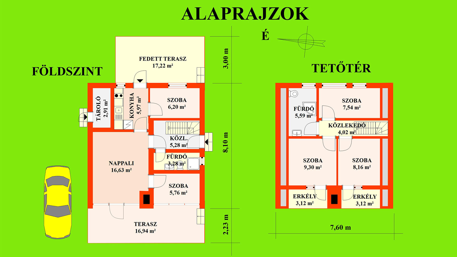 A földszint kb. 46,03 m2-es, a tetőtér kb. 34,61 m2 alapterületű