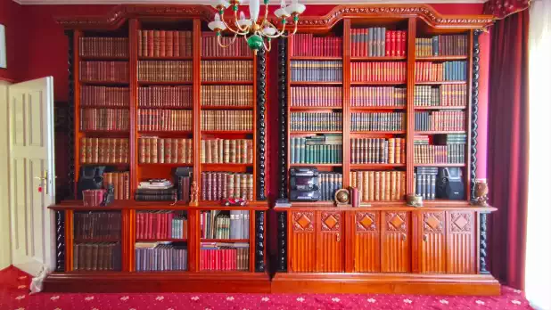 A könyvtárszoba egyik felében van az olvasósarok a kényelmes fotelekkel