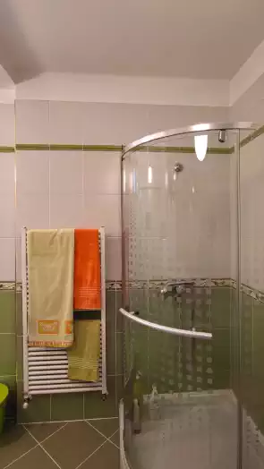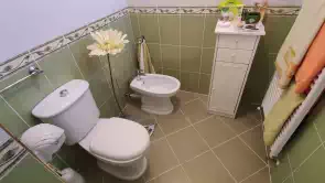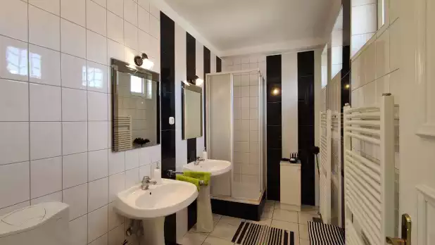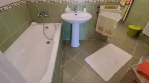 A képeken, az előző fürdőszoba látható. A két részre osztott fürdőszoba berendezési tárgyai: kád-, mosdó-, zuhanyozó-, WC-, Bidé.
