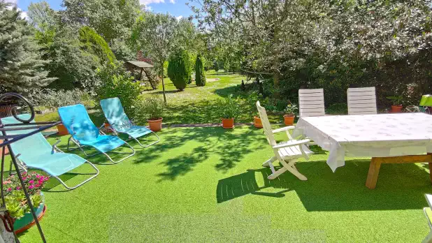 A konyhából és a hálószobából közvetlen kijárat van a tágas kertkapcsolatos 49,10 m2-es teraszra