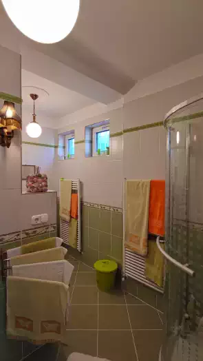 A földszinti hálószobához kapcsolódik a minden igényt kielégítő két részre osztott fürdőszoba, itt fűtés kiegészítőként a meleget a központi fűtésre csatlakozó, törölközőszárító radiátorok adják. A családi lakóházban összesen: 4 fürdőszoba és 6 illemhely (WC) található.