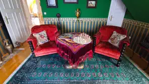 A 28,42 m2 alapterületű szalonban (nappali szoba), az otthon melegét és hangulatát a cserépkályha adja. A szalonból közvetlenül ki lehet menni a teraszra és gyönyörködni a Balaton látványában.