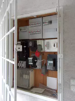 A villanyóraszekrény belseje látható a háromfázisú mérőórával, és az áramkörök kismegszakítóival. Ahogy itt kinéz, nem valószínű, hogy valaha is gond lesz vele. Minden vezeték védőcsőbe húzott vörösréz vezeték. A szerelés a Német szabványnak és precizitásnak megfelelően készült.